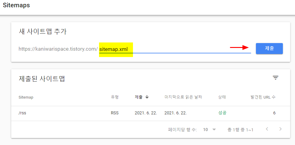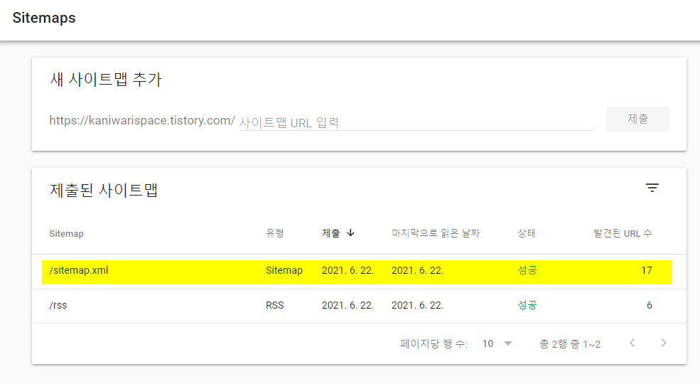 3. 제출된 사이트맵을 보시면 sitemap.xml 주소도 등록되어 있는 것을 확인할 수 있다.